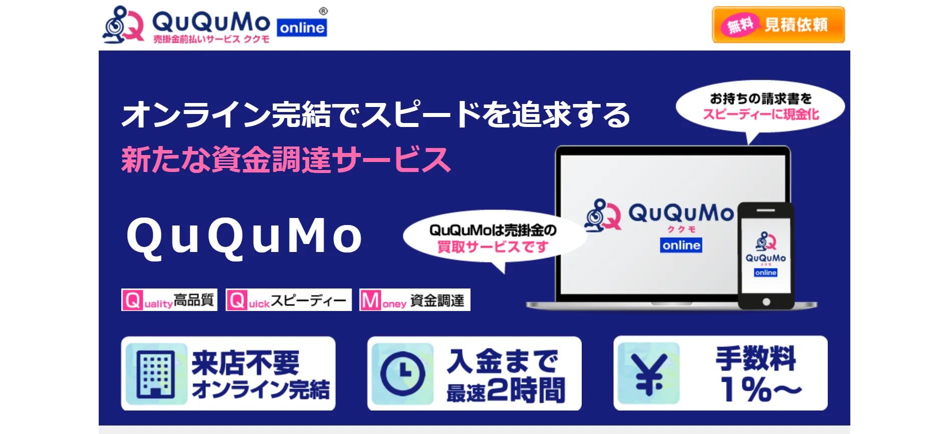 QuQuMoは、全ての手続きがオンラインで完結し、最短2時間での入金が可能な、即日ファクタリングに最適な会社です。